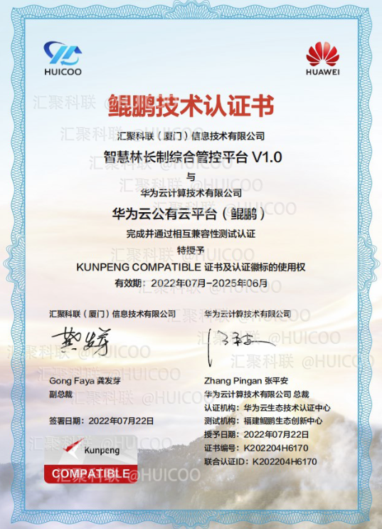 匯聚科聯自主研發的“智慧林長制綜合管控平臺1.0”與華為云計算技術有限公司的華為云公有云平臺(鯤鵬)完成并通過相互兼容性測試認證,正式獲得華為鯤鵬技術認證書